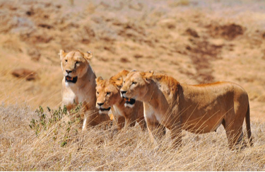 进入火山口没多一会儿,领队就提醒我们注意,前方有四只正在捕猎的狮子。狮子是母系社会,公狮母狮有着严格的分工,母狮负责在领地内捕食,只有在需要强大力量时雄狮才会出手。这四只健壮的母狮离我们的车只有10米,正在小心翼翼的匍匐前进,等待最佳时机猎杀不远处的开普水牛。通常,狮子在捕捉大型猎物(如水牛、长颈鹿)时,会选择携手合作;捕捉小型猎物(如疣猪、瞪羚)时,则很少合作,他们会选择一旁观望,待同伴成功杀死猎物后,才一拥而上分享战利品。阳光穿过云层,照射在火山口的湖泊上,远方是黑色的野牛群和羚羊群。表面平静的火山口暗藏杀机。我们等待捕杀的时刻,深深感受到了剑拔弩张的厮杀氛围。