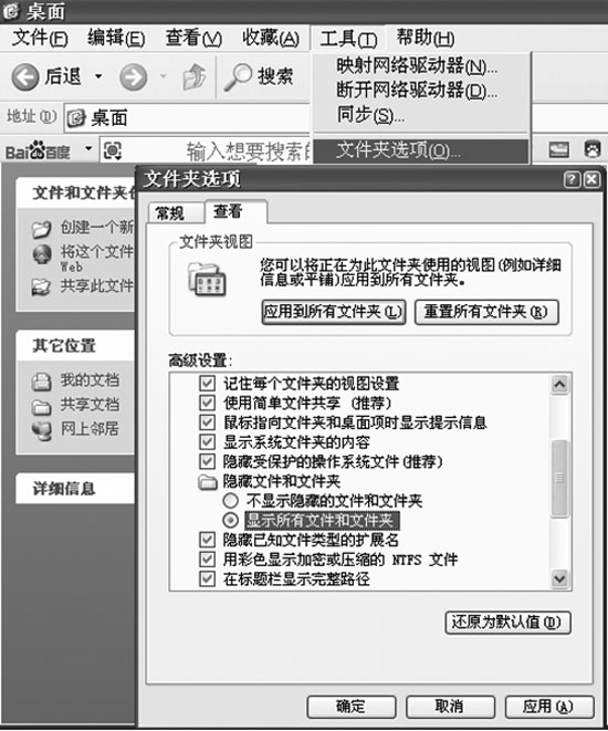 第四步:重启电脑后,单击[查看]→[文件夹选项],选择“显示所有文件和文件夹”,怎么样?文件夹中设置的隐藏文件是不是彻底消失了?