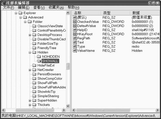 第二步:打开注册表,依次展开“HKEY_LOCAL_MACHINESoftwareMicrosoftWindowsCurrentVersionExplorerAdvancedFolderHiddenSHOWALL”分支(如图3)。