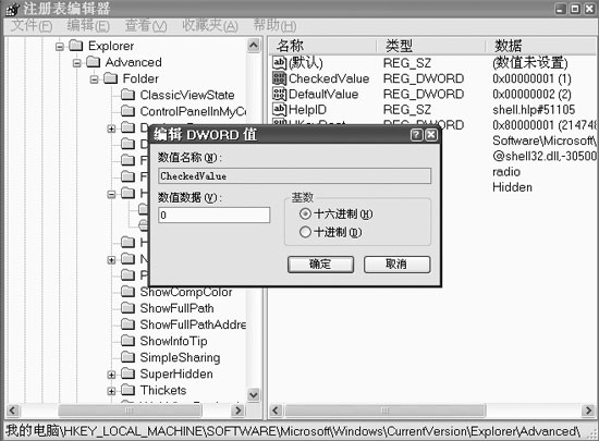 小贴士:将“CheckedValue”的“数值数据”改为“0”,其实就是将文件“查看”标签项中的选择“显示所有文件和文件夹”复选项设置成永远为“假”,即不可选择,从而达到永远隐藏的目的。