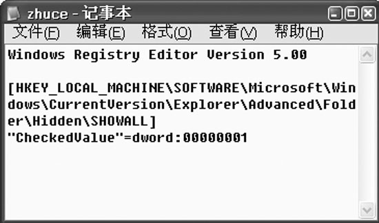 小贴士:若你的操作系统是Windows 2000/XP,文件开头第一行必须输入“Windows Registry Editor Version 5.00”;若操作系统是Windows 95/98/ME/NT 4.0,文件开头第一行必须输入“REGEDIT4”。在输入第一行后,必须空一行再输入文件注册表信息及其数值数据(此文件收录在光盘“秘技偷偷报”中)。