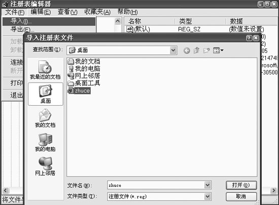 第二步:打开注册表,选取菜单[文件]→[导入]选项,找到事先编辑好的“*.reg”文件(如图6)。