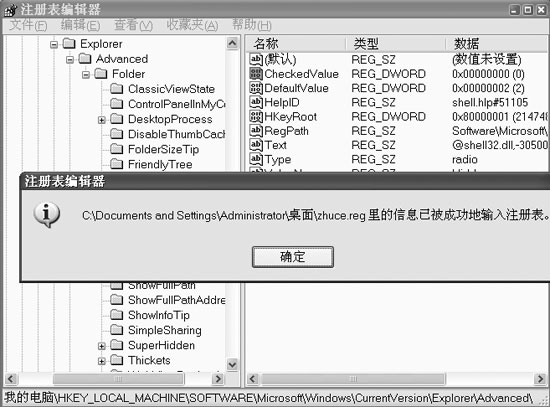 第三步:打开事先编辑好的“*.reg”文件,即可出现“‘*.reg’里的信息已被成功地输入注册表”的对话框,单击[确定]即可(如图7)。