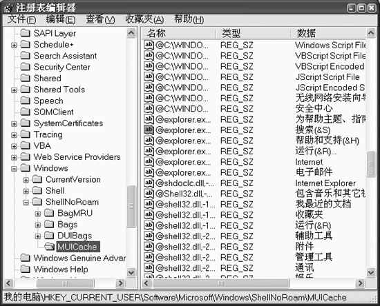 第二步:在注册表编辑器中依次展开“HKEY_CURRENT_USERSoftwareMicrosoftWindowsShellNoRoamMUICache”分支(如图3)。