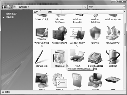 步骤一:打开[控制面板],切换到“经典视图”,然后双击[程序和功能](如图2)选项(这个其实相当于Windows XP中的“添加/删除程序”)。