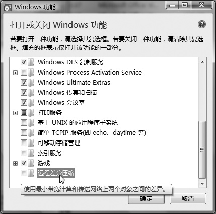 步骤二:打开“程序和功能”对话框,单击左方窗格中的[开启或关闭Windows功能]选项,弹出“Windows功能”对话框,找到最底下的“远程差分压缩”选项,取消前面复选框的对钩(如图3),单击[确定]按钮。经过处理后,本地磁盘间的文件复制操作会快许多。