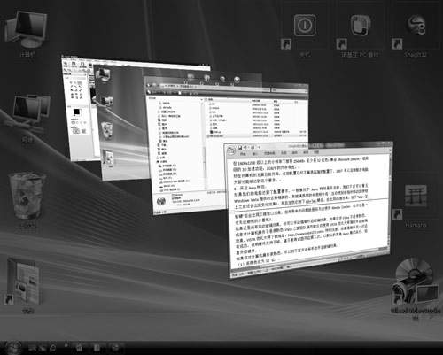 如果我们的电脑配置达到了要求,一般情况下Aero特效是可以开启的。开启后我们可以看到Windows Vista提供的这种精美的、有玻璃质感的半透明外观(把鼠标指针移动到按钮上时会发生变化),当我们按下“Win+Tab”键后,会出现程序切换的立体效果,每个程序窗口都一目了然,使切换更加方便、准确(如图2)。