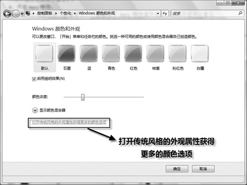 在“个性化”菜单中选择[Windows颜色和外观],单击[打开传统风格的外观属性获得更多的颜色选项](如图5),选择配色方案为[Windows Aero]。
