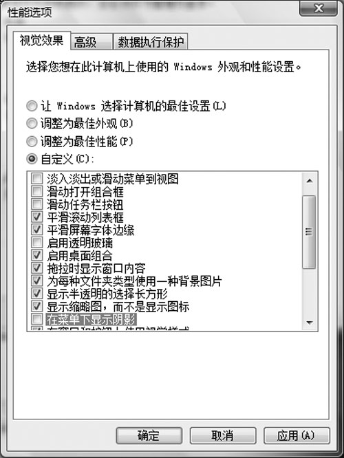 右键点击“计算机”,依次单击[属性]→[高级系统设置]→[设置],打开“性能选项“窗口,去除以下选项前方的对钩(如图6)。