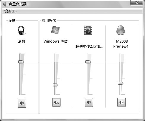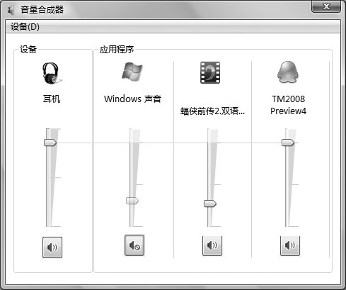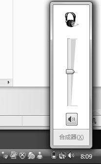 首先,我们打开暴风影音和QQ,然后单击右下角的喇叭图标(如图2)。音量控制很简单,只有一个调节音量的滑块,它可以控制电脑的整体音量,跟XP系统基本相同。现在让我们单击静音按钮下的[合成器]。