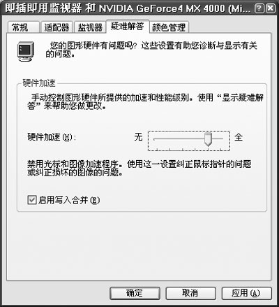 第二步:在打开的面板中选择[疑难解答],将“硬件加速”后的滑块从“全”逐渐拖动到接近“无”的位置,然后[确定](如图4)。