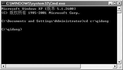 第二步:在“C:DocumentsandSettingsAdministrator>”后输入命令“cdc:qidong”后按回车键,通过“命令提示符”打开“c:qidong”文件夹(如图4)。