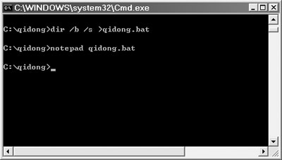 第三步:在“c:qidong>”后输入命令“dir/b/s>qidong.bat”创建“qidong.bat”批处理文件,接着输入命令“notepadqidong.bat”(如图5)—用记事本打开“qidong.bat”批处理文件。