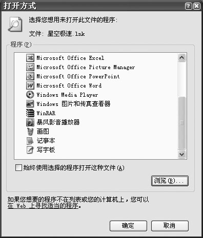 第二步:在弹出的“Windows”对话框中选取“从列表中选择程序”,然后[确定]进入“打开方式”对话框,找到快捷方式所对应的程序(如图7)。