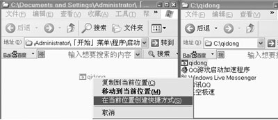 第三步:测试完批处理文件后,打开“C:qidong”文件夹,按住鼠标右键将“qidong.bat”批处理文件拖入“开始|所有程序|启动”文件夹中,在弹出的菜单中选择[在当前位置创建快捷方式](如图8)。
