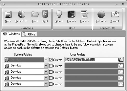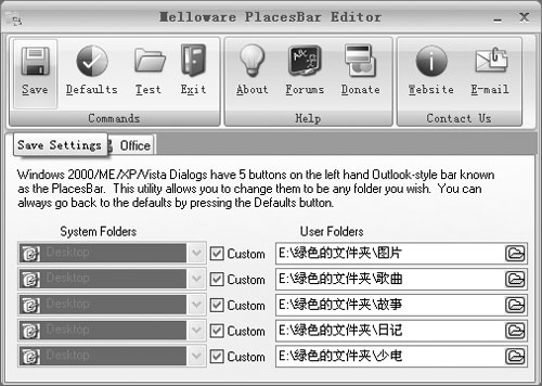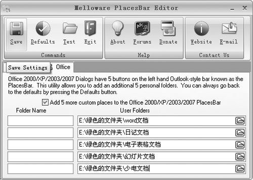 单击[Office],并勾选其下方的“Add5morecustomplacestotheOffice2000/XP/2003/2007PlacesBarUserFolders”选项,然后和上面的设置一样,将自己常用的“打开/保存”Office文件的文件夹放到里面,如Word文档、电子表格文档、幻灯片文档、日记文档等,最后单击[Save]保存即可(如图4)。