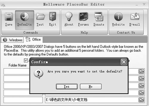 小贴士:如果想恢复到以前系统默认的状态,可在PlacesBarEditor窗口工具栏中单击[Defaults](缺省默认),并在弹出的确认框中单击[Yes]即可(如图5)。