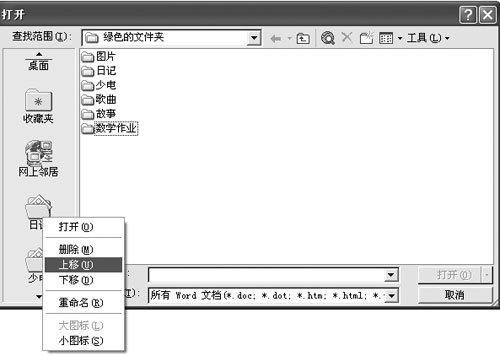 按照上面的方法把Office常用的文件夹添加到里面,不过新添加的文件夹排在最下边。如果你觉得它的“地位”有点低,可以在添加的文件夹上单击右键,在弹出的快捷菜单中单击[上移]提高它的“地位”。不要心急一次只能提升一格(如图9)。