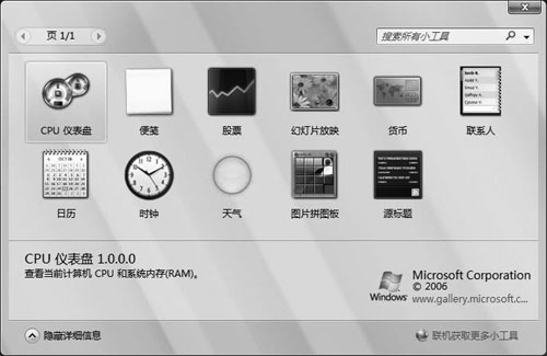 侧边栏中的小工具可以根据需要添加或删除。单击侧边栏上方的按钮,会弹出一个工具选择窗口(如图3),显示的是目前系统中已经安装的小工具。点击左下角的[显示详细信息]会出现小工具的一些功能信息。如果有自己喜欢的小工具,只要双击它即可将其添加到侧边栏中。