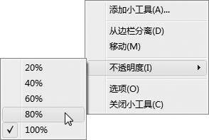 除此之外,还可以对小工具进行设置,例如我们可以把小工具从侧边栏分离出来,拖到桌面的任意位置;还可以改变小工具的透明度(如图6)。