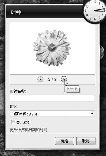 对几个比较特殊的小工具,可以通过[选项]功能对其进行设置。嫌这时钟太土、太难看?没关系,在“时钟”工具上单击右键,选择[选项],在弹出的对话框中不仅可以选择所在的时区,还可以变换时钟的样式(如图7)。怎么样?这款“菊花钟”还凑合吧?