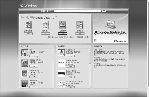 在小工具选择界面中点击[联机获取更多小工具],IE浏览器会打开微软官方的侧边栏小工具下载网站,网站上罗列了许多小工具(如图8)。选中自己喜欢的小工具后,点击[下载]即可。
