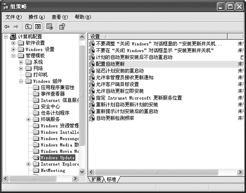 在弹出的“组策略”窗口的左边依次打开[计算机配置]→[管理模板]→[Windows组件]→[WindowsUpdate](如图1)。