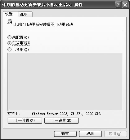 在“组策略”窗口的右侧用鼠标右键单击[计划的自动更新安装后不自动重启动],在弹出的快捷菜单中选择[属性],在弹出的“计划的自动更新安装后不自动重启动”对话框里,选择[已启用],然后单击[确定](如图2)。