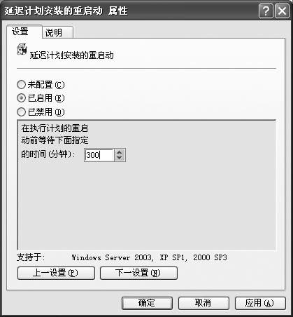 用同样方法启用[延迟计划安装的重启动],并在“在执行计划的重启动前等待下面指定的时间”后输入一个较长的时间,如“300”(如图3),单击[确定]。再启用[重新提示计划安装后的重启动],同样在等待时间里输入“300”。