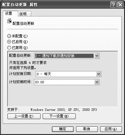 最后一定要启用[配置自动更新],否则3、4步操作将失去作用。如果我们不想及时升级,可以在“配置自动更新”后面的下拉框中选择“通知下载并通知安装”(如图4)。
