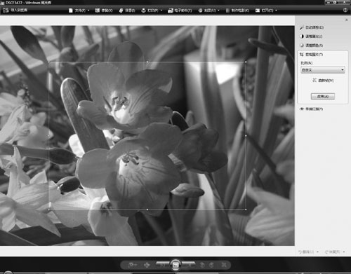 鼠标左键单击[剪裁图片],照片上会出现一个可调节尺寸,且可拖动的选择框(如图5)。框内的部分亮度不变,内容会被保留;框外变暗的部分是即将被裁掉的内容。调整好选择框的大小后,单击[应用]即可。