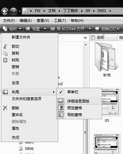 说明:单击[组织],在“布局”里可以设定资源管理器的各个部分,包括是否显示菜单栏等(如图7)。如果全不选,资源管理器会只剩下主窗口,类似XP系统的“我的电脑”界面。在“组织”下拉菜单里单击[文件夹和搜索选项]会打开“文件夹选项”对话框,这跟XP系统类似,许多设置比如“是否显示/隐藏文件”等可以在此更改。