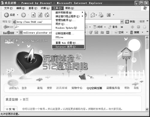 打开IE游览器,依次单击菜单栏中的[工具]→[Internet选项](如图1)。