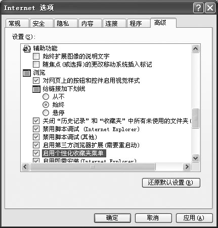 在“Internet选项”对话框中单击[高级],在“设置”框下找到“浏览”选项里的“启用个性化收藏夹菜单”,并勾选此项,然后单击[确定](如图2)。