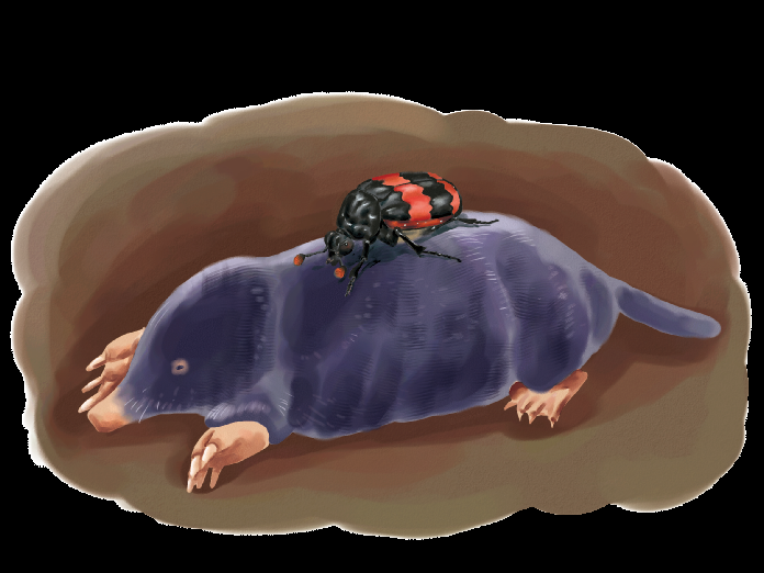 鼹鼠这样的死动物,还会给我们造就另一种效能极佳、名声响亮的“土壤改良器”——葬甲。葬甲是一种甲虫,常被称为食尸虫,它们的身材、服饰和习俗方面都与别的清洁工截然不同,它可以散发麝香气味;它的触角末端顶着红绣球,胸廓上裹着米黄法兰绒,鞘翅上还横拦着两条朱红色的佩带。这装束雅致而近乎奢华,比尸体下面其他虫类的服装高级多了。