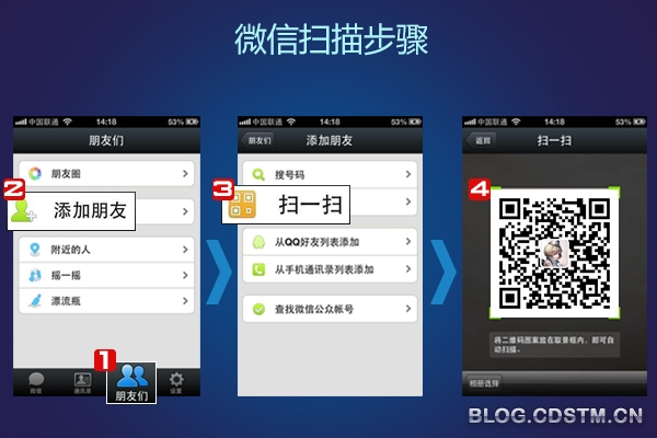 我们常见的二维码是一个方形的,它通过黑、白两种颜色(或另外两种颜色)像素的不同分布进行编码。在相应位置上,用点表示二进制的“1”,用空白表示二进制的“0”,点的排列组合确定了二维码所代表的信息。如果我们的手机中装有“微信”应用程序,按照“微信-朋友们-添加好友-扫描二维码”的顺序打开扫描二维码功能,对准二维码扫一扫,信息传到网络上,计算机图像处理技术会自动识读处理,读出二维码上记载的信息。