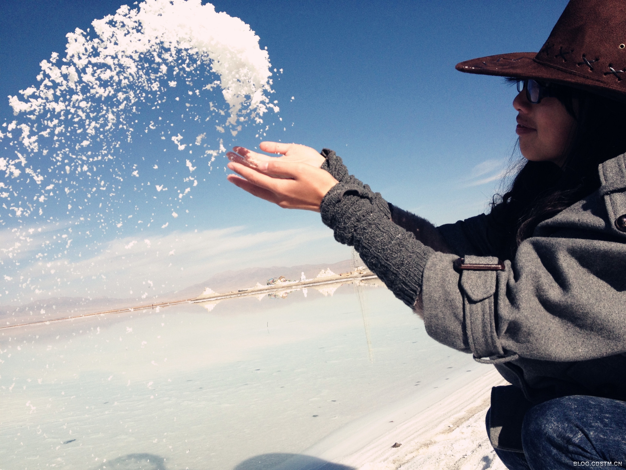 当卤盐的晶体送走最后一汪湖水,盐湖的生命便从此消殒于历史,白茫茫的盐晶堆积万里——盐沼形成了。盐沼是盐湖蒸发完毕的产物,除非短暂的雨季降水,不然,盐沼的地面就是一片万里盐漠。而如果有短暂的降水,在盐沼上覆盖一层淡淡的水膜,风从表面掠过,此时的盐沼便成了一面平铺的镜面。