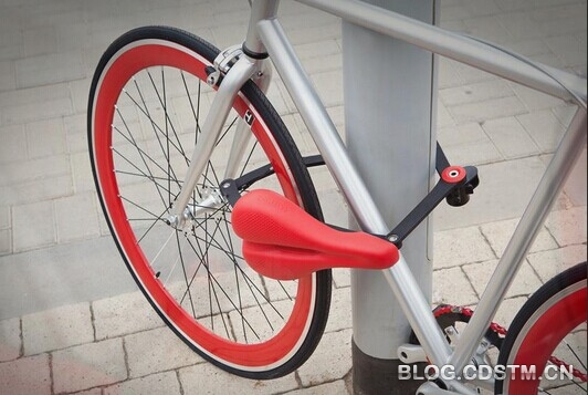 咦?这辆自行车的锁在哪里?抽出车座试一下呗!直接把车座从支撑杆上取下,哦,原来在车座里竟藏着一把长达1米、可折叠的三段式链锁!这把锁由硬钢材制成,外部覆有塑料涂层,坚固的同时美观度也不差呢!锁车时,用它把车身和任意一个栏杆或固定物连接起来,就可以离开了!