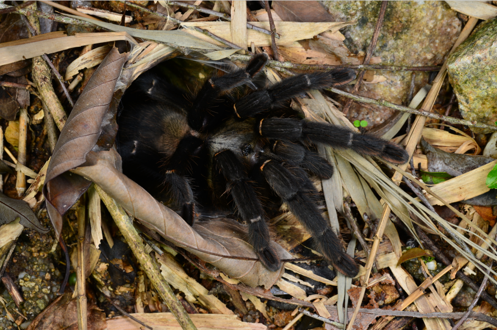 海南捕鸟蛛应该算是国内最大的蜘蛛了,它们主要分布在海南和广西。成年海南捕鸟蛛可以长到比成年人的手掌还要大,因为它们身披一层黑色的绒毛,所以也被称为“黑地老虎”。海南捕鸟蛛数量不少,但在野外并不好找。它们在向阳面的倾斜土坡上打洞筑巢,这些坡面上一般都铺有比较厚实的落叶或者枯枝,洞穴的隐蔽性非常好。成年海南捕鸟蛛有很强的挖掘能力,它们的洞穴挖得非常深,洞口通常比乒乓球要大一些,会铺设一些落叶或者干草,然后再缀满丝线,看起来就像是盘丝洞。这些丝线并不会起到缠绕猎物的作用,估计主要是让在洞口等待猎物的蜘蛛待得更舒服一些吧。