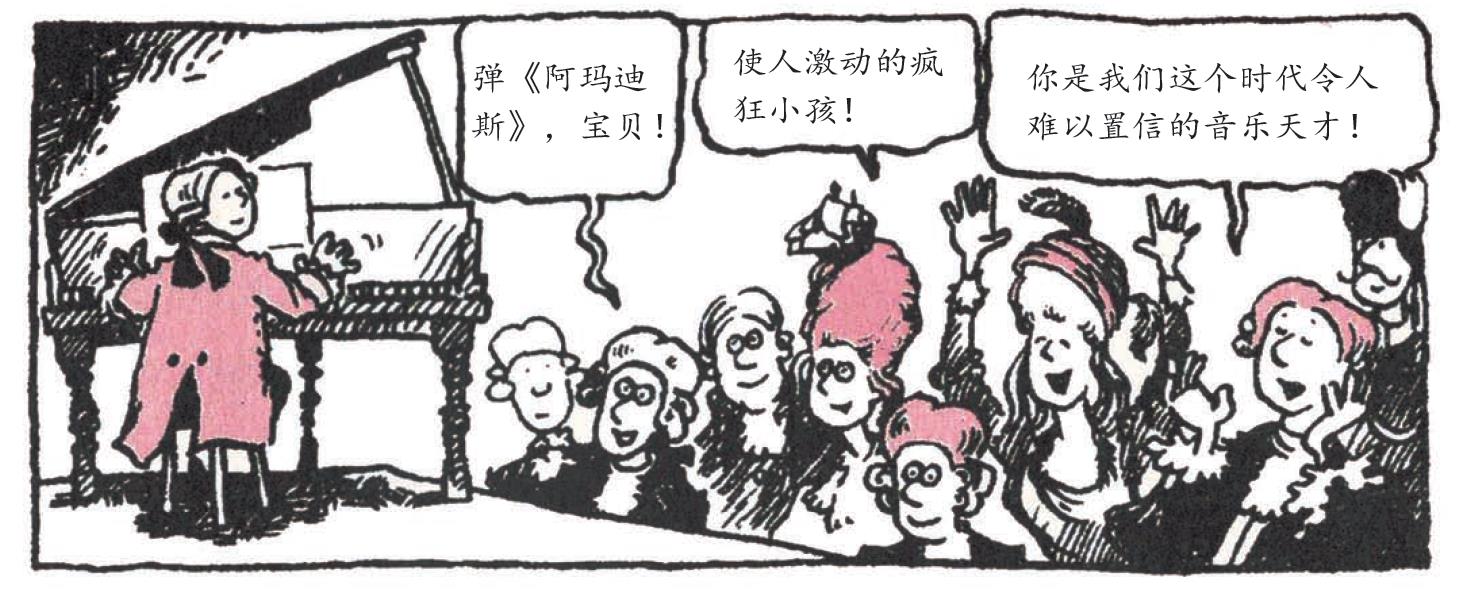 3.当莫扎特不需要在很多富有而欣赏他的听众面前演奏音乐时,他非常喜欢自娱自乐。他最中意的、放松的方法是:两腿间夹着一根棍子,假装在骑马。然后他快乐地满屋飞跑,咂舌头,发出各种噪声……不要怀疑,以上都是真的!为什么?因为当莫扎特开始欧洲大漫游时,他刚满7岁!他就是一个所谓的“神童”——这种人在成名之前的缓慢成长中毫不起眼,因此他们几乎是在眨眼之间突然变得显赫的。