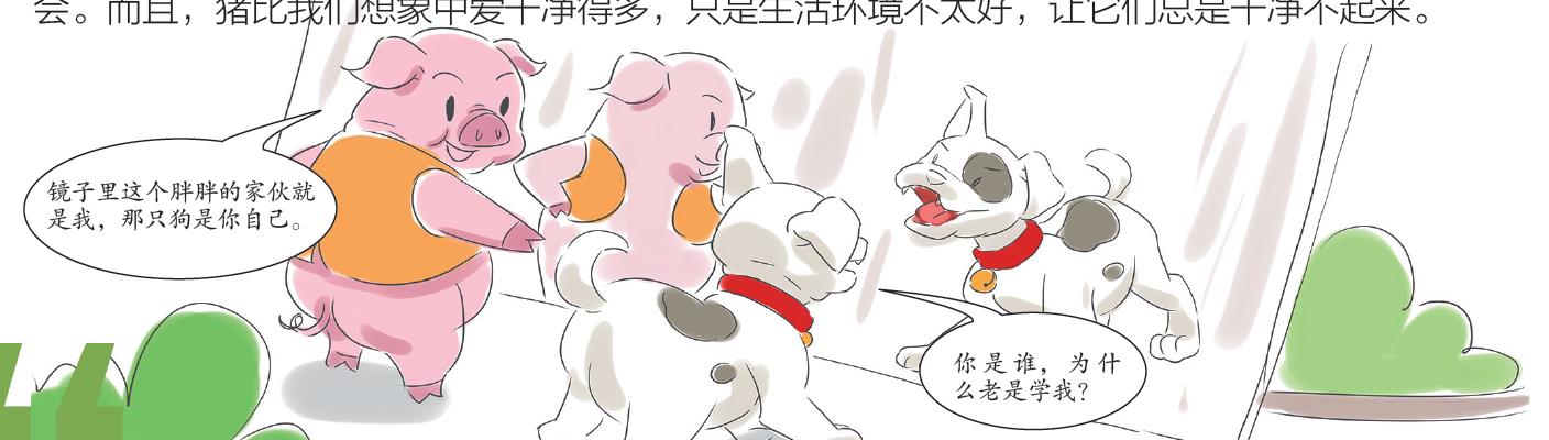 A:虽然我们经常说“笨猪”,但其实猪一点都不笨。比如说,大多数动物其实认不出镜子中的自己,而猪不仅知道镜子里的是猪自己,甚至有的猪还聪明到能够欺骗它那些没那么聪明的同伴。很多狗需要重复训练近十次才能学会的技巧,有的猪只要看一遍示范动作就能学会。而且,猪比我们想象中爱干净得多,只是生活环境不太好,让它们总是干净不起来。
