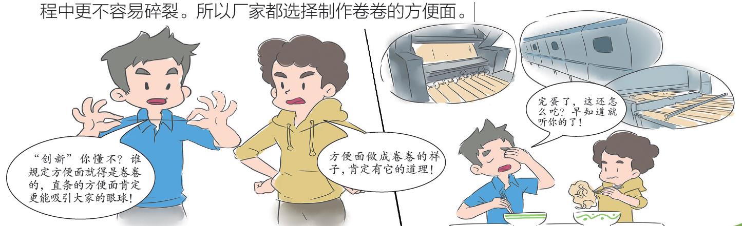 A:一方面,在制作过程中,卷曲的方便面不会像直条的面那样粘在一起,蒸煮、油炸和晾干都更方便;另一方面,扭曲的方便面相互交错,就像是坚固的楼房一样,在运输的过程中更不容易碎裂。所以厂家都选择制作卷卷的方便面。