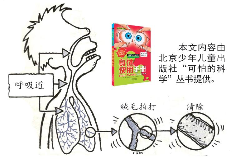 身体所有的呼吸管道里面布满了黏稠的鼻涕。管道里极其微小的绒毛每秒钟拍打上千次,把鼻涕和所有粘在上面的东西向嘴的方向推,这些东西每小时走1.5厘米。