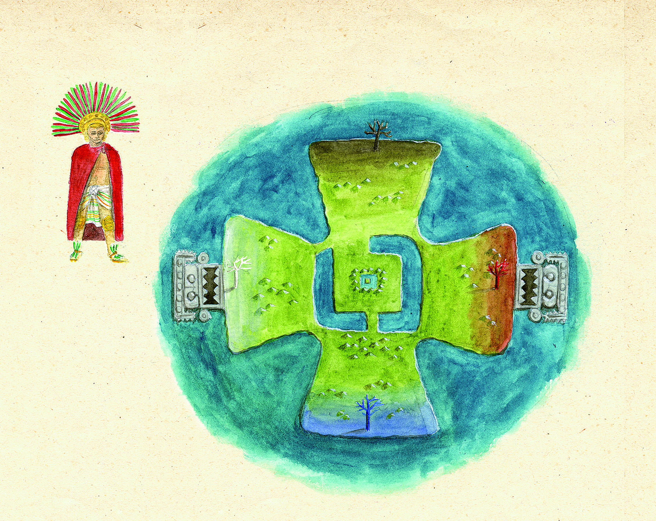 墨西哥的阿兹特克人认为大地是平的,而且是十字形的;印度的高僧世亲认为大地是漂浮于海洋上的微小三角形土地,而我们的世界是无数个相似的世界中的一个;古希腊人科斯玛斯曾在一本书中指出,大地是一个长度为宽度两倍的长方形平面;但俄罗斯的萨哈人把大地想象成八边形,大地中央还有一个通往另一个世界的洞。
