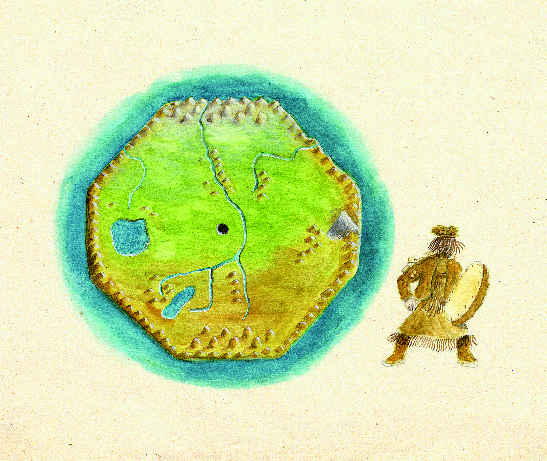 中世纪欧洲人和阿拉伯人绘制的地图中,大地多呈圆形;有些地理学家会把地图画成椭圆形;冰岛的维京人认为大地是一个圆盘,正中有一棵巨树,周边环绕着山峰,外围则是海洋;委内瑞拉的叶库纳人认为大地边缘有六根拔地而起的柱子支撑着天顶,中央则是大海!