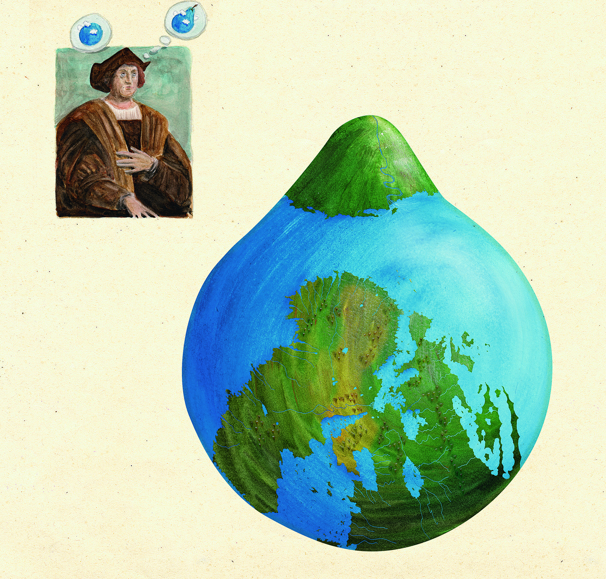 希腊哲学家柏拉图认为圆球形的大地悬在空中,在宇宙中心固定不动,此外还有另外两个大陆:因地震而沉入海底的亚特兰蒂斯岛,和居民们都是头朝下、脚朝上行走的“反地球”。西班牙人哥伦布在开辟新大陆后,认为地球并不是完美的圆球形,而是梨形。