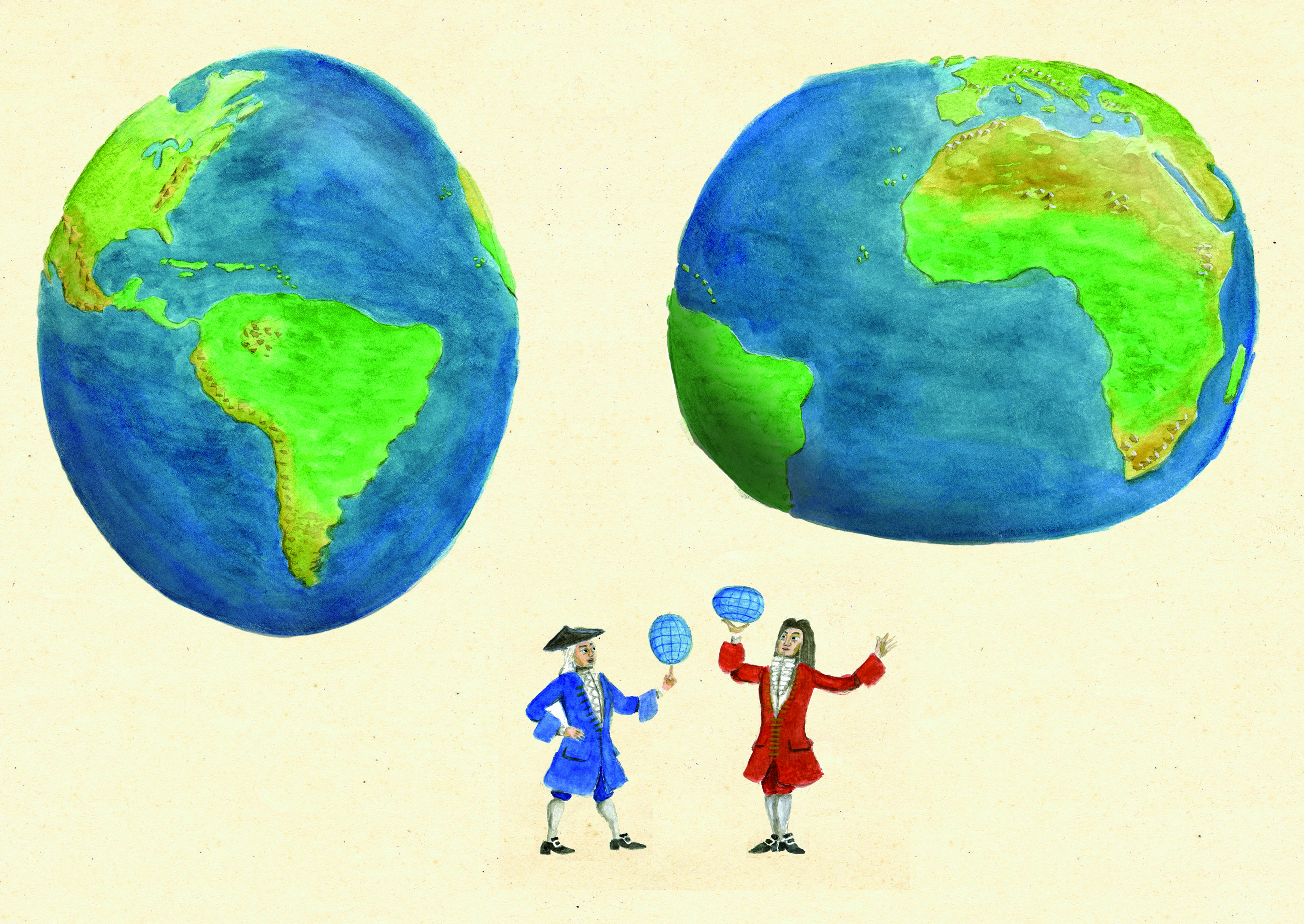英国科学家牛顿假设地球内部是液态的,由于地球不停地自转,在离心力的影响下,表面的水和内部的液体会向赤道聚集,因此他认为地球应该是两极较扁、赤道较鼓的扁椭球体。但天文学家兼几何学家雅克·卡西尼在进行了精确计算后,认为地球是长圆球体,两极凸出,赤道略扁。当然,现在我们都知道,他算错了!