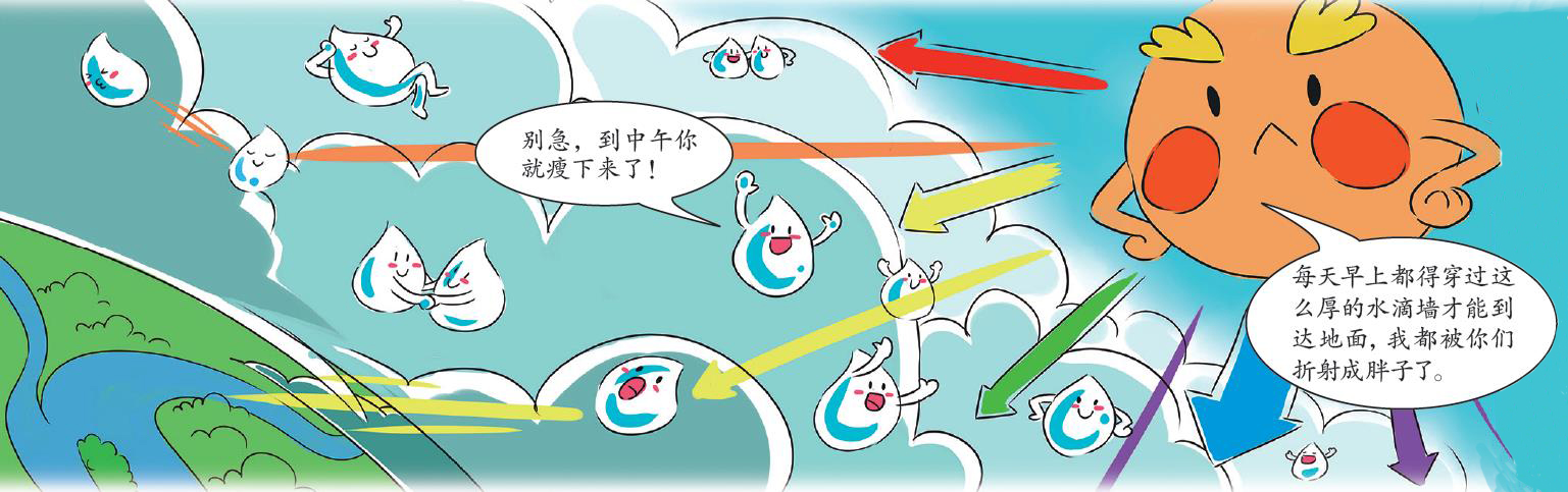 A:太阳光进入地球大气层时,会在大气层无数细小的水滴中发生折射。早晨,空气中细小的水滴较多,再加上太阳的位置低,阳光穿过厚厚的大气层要走过更长的路径,经受更多的水滴折射后,才能抵达我们的眼睛,因此早晨的阳光被折射得更厉害,太阳看起来就更大(为什么折射越厉害,看起来就越大?这需要用到高中的物理学知识来解释);中午,太阳几乎竖直地挂在头顶,直射下来的阳光穿透大气层的路径更短,折射较少,所以太阳看起来也比较小。