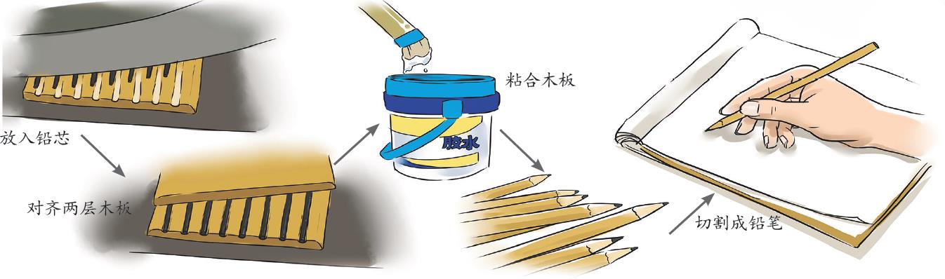 A:铅笔像个三明治,笔芯是被“夹”进去的。人们将大块的木料切成薄板,在每一块薄板上切割出凹槽;在每一条凹槽里放入一根笔芯后,再将另一块带凹槽的薄板粘到第一块薄板上方;等胶水干了,再将薄板分割成铅笔;最后,将两块薄板的接缝处打磨平整,并给铅笔刷上多层油漆,这样它从外表上看就是一个完好的整体了。
