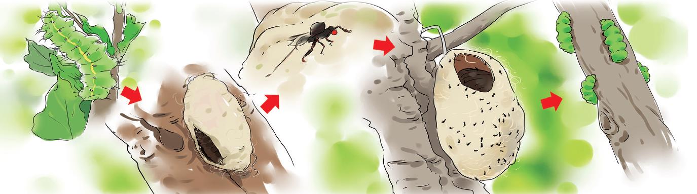 A:那些是柞(zuò)蚕茧做成的“杀手胶囊”!人们在柞蚕茧上剪开一个洞,让里面的蛹成为寄生蜂的摇篮,最终羽化出来的不是柞蚕,而是专门寄生在各种毛毛虫身上的周氏啮小蜂。这些周氏啮小蜂最后会飞到周围去灭掉各种毛毛虫。
